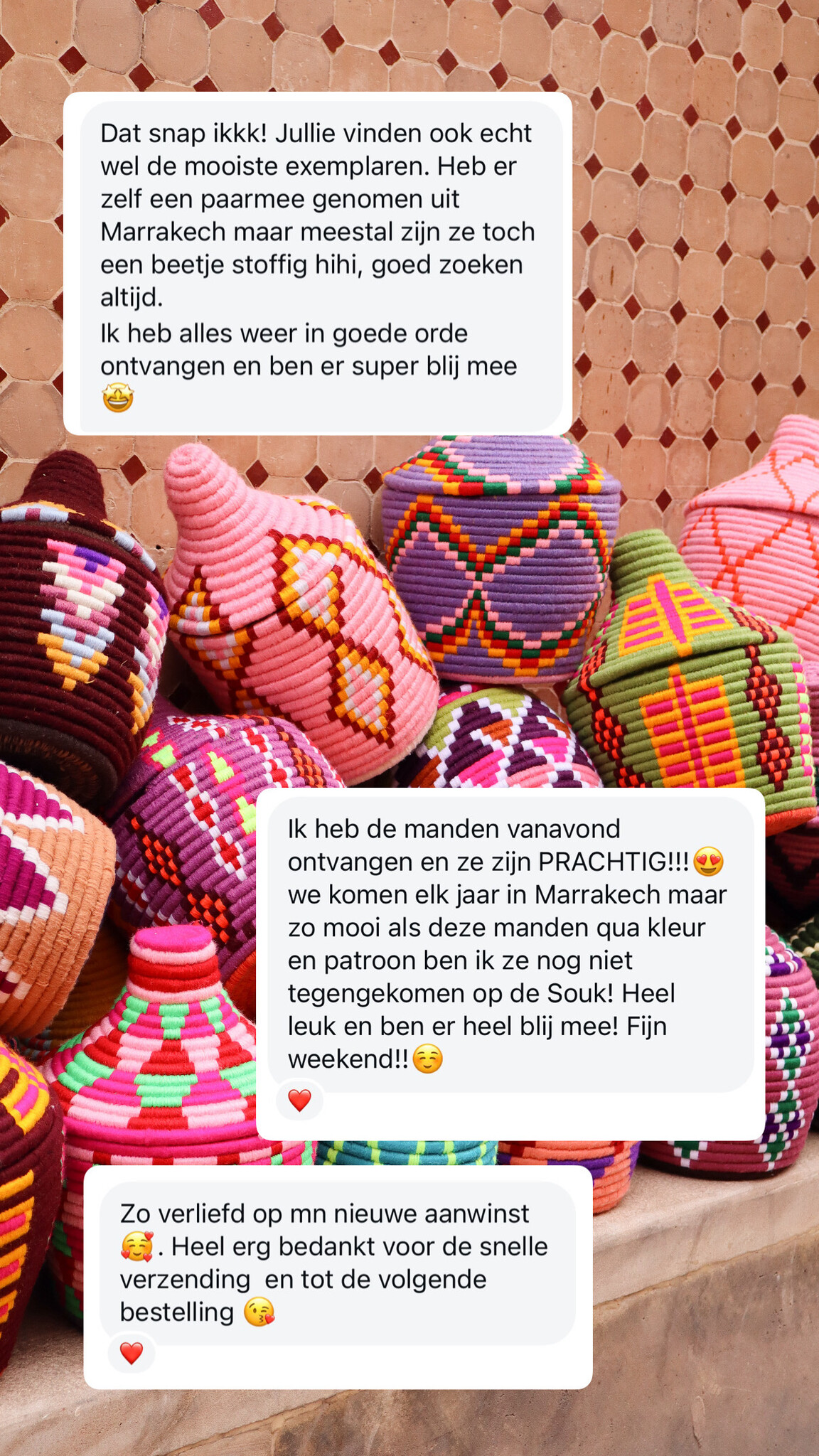 Club Nomad werkt nauw samen met de getalenteerde artisans en coöperaties in Marokko. Door de jarenlange samenwerking hebben we het privilege verworven eerste keuze te hebben tijdens het selecteren van producten. Hierdoor zijn we in staat producten aan ons assortiment toe te voegen in de mooiste kleuren en patronen. Dit horen wij ook terug van onze klanten (zie hieronder) die net als Club Nomad waarde hechten aan heldere tinten en sprekende kleurcombinaties.